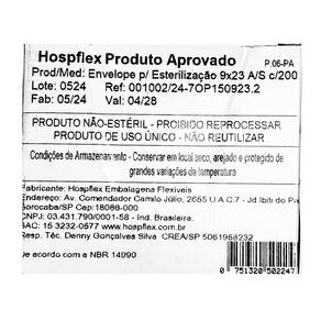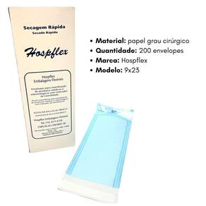 Eleve o padrão de segurança dos seus procedimentos com os Envelopes para Esterilização Auto Selantes Hospflex!Especificações do Produto:• Quantidade: 200 envelopes• Modelo: 9x23• Material: papel grau cirúrgico• Marca: HospflexCaracterísticas Principais:Confeccionado com papel de grau cirúrgico e filme laminado de alta resistênciaFita auto selante para fechamento rápido e seguro, sem necessidade de seladoras térmicasIndicador químico do processo de esterilização para confirmação visualSistema triplo de selagem para máxima proteçãoPacote com 200 unidades para sua conveniênciaSegurança e Qualidade:Os envelopes para esterilização Hospflex são projetados para oferecer a máxima proteção e eficácia no processo de esterilização. O papel de grau cirúrgico e o filme laminado garantem uma barreira efetiva contra microrganismos, mantendo a esterilidade do conteúdo até o momento do uso.Compatibilidade:Nossos envelopes 9x23 são compatíveis com autoclaves a vapor e óxido de etileno, atendendo às necessidades de diversos estabelecimentos de saúde.Facilidade de Uso:A fita auto selante elimina a necessidade de seladoras térmicas, tornando o processo de embalagem mais rápido e conveniente. O indicador químico muda de cor após a esterilização, proporcionando uma confirmação visual imediata do processo.Instruções de Uso:1. Coloque o instrumento limpo e seco no envelope.2. Remova a fita protetora e dobre a aba adesiva.3. Pressione firmemente para selar.4. Coloque na autoclave seguindo as instruções do fabricante.5. Após a esterilização, verifique se o indicador químico mudou de cor.6. Armazene em local seco e protegido até o momento do uso.Armazenamento:Para manter a integridade dos 200 envelopes Hospflex, armazene-os em local seco, protegido da luz solar direta e em temperatura ambiente.Por que Escolher os Envelopes para Esterilização Hospflex?• Qualidade superior do papel grau cirúrgico• Confiabilidade comprovada do modelo 9x23• Quantidade conveniente de 200 unidades por pacote• Excelente relação custo-benefício Ean: 751320502247
