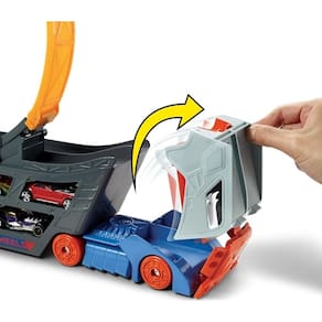 Para iniciar a diversão, encaixe os dois lados da alça no lugar e gire o lançador dobrável para fora. Puxe a cabine na frente para criar um salto dramático e lance seus carros através da alça, aterrissando o salto repetidamente. Para transportar, dobre todo o conjunto de brinquedo de volta e carregue seus carros na caçamba do caminhão, pronto para o próximo show de acrobacias Hot Wheels.