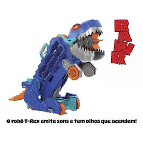 Abaixe a cauda e ela se transforma em um Robo T-Rex com luzes e sons e uma pista de corrida de duas faixas. As crianças também podem lançar carros de sua boca! Inclui dois carros Hot Wheels® em escala 1:64. As cores e as decorações podem variar.