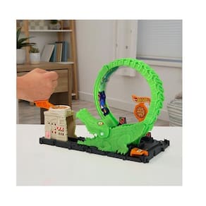 Um crocodilo invadiu a pizzaria Hot Wheels para devorar carros, a menos que as crianças possam detê-lo com suas incríveis manobras. Reposicione a cauda gigante do crocodilo para criar um loop ou hélice para uma brincadeira versátil na pista. Quando as crianças lançam seus carros, elas podem derrubar o crocodilo e correr em direção a novas aventuras. Inclui um carro Hot Wheels que pode se conectar a outros conjuntos. Conjuntos adicionais vendidos separadamente. As cores e as decorações podem variar.