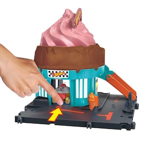 Delicie-se brincando com as pistas do conjunto Hot Wheels City Downtown Ice Cream Swirl! O conjunto em forma de cone de sorvete conta com um elevador movido pela criança que gira os carros para cima, pelo sorvete e até a rampa dobrável para aventuras ainda mais deliciosas. O brinquedo inclui um carro Hot Wheels e se conecta a outros conjuntos.