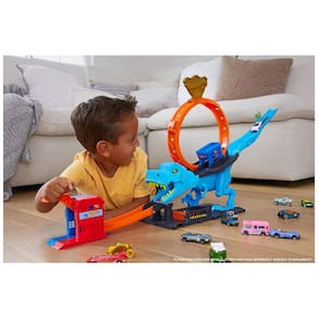 Derrube o dinossauro e salve o dia no Conjunto Hot Wheels City TRex ChompDown. Apresentando um lançador e um loop de 9 polegadas onde as crianças lançam seus carros Hot Wheels na hora certa para derrotar a fera. Quando o dino é nocauteado, seus olhos mudam de amarelo zangado para Xes de nocaute. Inclui um veículo Hot Wheels e se conecta a outros conjuntos. Voltado para crianças a partir de 4 anos de idade. Cores e decorações podem variar. Corra pela boca de um gigantesco TRex que está tentando comer a Hot Wheels City. Cronometre perfeitamente para derrubar o dinossauro e salvar o dia! As crianças colocam o carro Hot Wheels incluído na delegacia e, em seguida, acionam o lançador para enviá-lo através de um grande loop até a zona de derrota. Quando o dinossauro cai derrotado, seus olhos mudam de zangados para Xes. A base da pista inclui detalhes temáticos de delegacia para inspirar aventuras criativas e se conecta a outros conjuntos para que as crianças possam expandir sua Hot Wheels City. Conjuntos adicionais vendidos separadamente. Inclui 1 carro de brinquedo Hot Wheels na escala 1:64, tornando-se um ótimo presente para crianças a partir de 4 anos de idade.