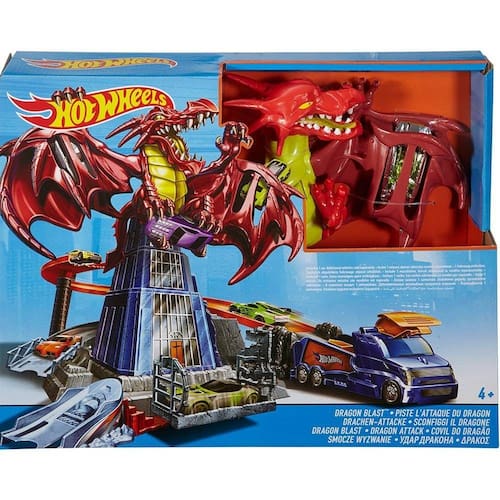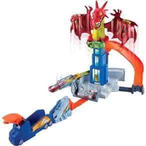 Sua missão é derrotar o dragão e salvar a cidade Este grande conjunto Hot Wheels vem repleto de aventura radical e uma história emocionante, onde tudo pode acontecer. Ao lançar seu carro contra o dragão, ele fica nervoso e abre as asas, revelando muitos níveis de ação. Cuidado para não cair em sua jaula. Para derrotar o inimigo, mova a segunda rampa para tentar atacar sua cauda. É o único jeito de derrotá-lo. O lançador vira um veículo. Inclui um veículo Hot Wheels, mas você pode adicionar seus outros carros e aumentar a diversão. Aplicável com outros conjuntos e pistas Hot Wheels. As cores e decorações podem variar.