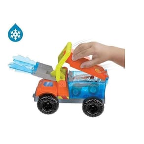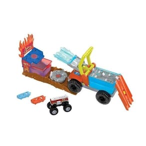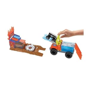 A mudança de cor fica mais intensa com o conjunto Hot Wheels Monster Trucks Arena Smashers Color Shifters 5 Alarm Rescue. As crianças podem conduzir o Color Shifters HW 5 Alarm para dentro do tanque de água gelada de uma plataforma removível para iniciar a primeira mudança de cor antes de mirar em uma parede de chamas atrás de uma arquibancada. Acerte o ponto de colisão e o 5 Alarm baterá nas arquibancadas: os dois carros para esmagar e o Monster Truck caem na água morna, mudando a decoração mais uma vez. Dê uma volta na unidade giratória para retirar o excesso de água antes de repetir o desafio.