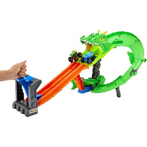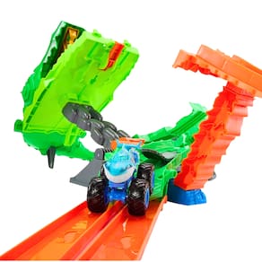 Descrição do produto : Começou a corrida entre os Monster Trucks Great Bite e Rageasaur da Hot Wheels para derrotar o dragão Nêmesis no conjunto Tubarões vs. Dinossauros: Destruição do Dragão. Você pode carregar os caminhões incluídos no lançador duplo e, em seguida, fazê-los correr lado a lado pela boca do dragão ciborgue. Eles correm pelas entranhas do dragão, onde um desviador de motosserra escolhe aleatoriamente um dos três resultados: reter os dois Caminhões, tirar um deles da pista ou deixar que ambos escapem para derrotar o nêmesis. Quando o dragão desmorona, as crianças podem se lançar em sua boca e reivindicar o troféu. Dois Hot Wheels Monster Trucks em escala 1:64 estão incluídos. As cores e as decorações podem variar. :