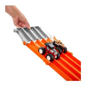 Os Monster Trucks Mega-Wrex e Tiger Shark da Hot Wheels se enfrentam em uma corrida de descida onde um desviador decide aleatoriamente quem vencerá e quem capotará e baterá. Você pode colocar os caminhões de brinquedo em escala 1:64 incluídos na posição de partida e, em seguida, levantá-los para enviá-los em alta velocidade para a linha de chegada.
