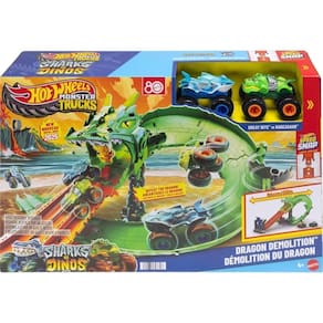 Os Monster Trucks Hot Wheels Great Bite e Rageasaur estão prontos para dar tudo de si neste playset Sharks vs. Dinos Dragon Destroyer para derrotar o dragão adversário.