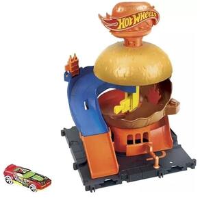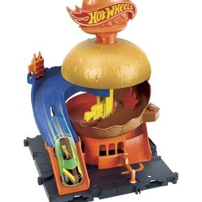 Ao lutar contra as criaturas de Hot Wheels City, entre no Hot Wheels City Downtown Burger Drive-Thru para comer em movimento. Mas cuidado com os inimigos perigosos que deram uma mordida no hambúrguer! As crianças giram o sinal do logotipo e os carros rolam automaticamente pelo drive-thru, onde detalhes legais aprimoram a brincadeira e a diversão. Confira o cardápio e o portão móvel em formato de espátula.