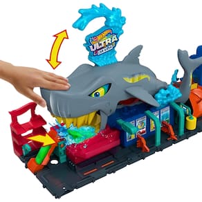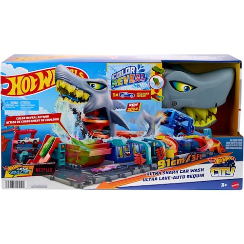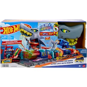 Conforme apresentado na série da Netflix, Lets Race, o Hot Wheels City Car Wash foi tomado por um enorme tubarão que quer mergulhar em ação de mudança de cor! As crianças dirigem o veículo Color Reveal incluído pela rampa até a boca do tubarão, depois pressionam a cabeça do tubarão para mudar a cor da água e revelar a decoração do carro. Encoste o tubarão e observe o carro correr por dentro enquanto o excesso de água escoa. Toque na cauda do tubarão para lançar os carros do estacionamento ou no tanque de água gelada para uma surpresa de mudança de cor. Mude as cores do carro passando pela lavagem novamente. A reprodução detalhada da pista na base aprimora a narrativa com portões móveis e um rolo de espuma que lembra um lava-rápido da vida real. O conjunto dobra-se ao meio para facilitar o armazenamento e inclui uma alça para ajudar a carregá-lo e drenar o excesso de água. Um veículo Hot Wheels Color Reveal está incluído. Cores e decorações podem variar.