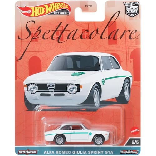 O Hot Wheels Premium 5/5 - Alfa Romeo Giulia Sprint GTA celebra o lendário carro esportivo italiano dos anos 60. Parte da linha Premium, este modelo destaca o design clássico e o desempenho de corrida, com detalhes realistas e acabamento de alta qualidade, ideal para colecionadores e fãs de carros históricos.