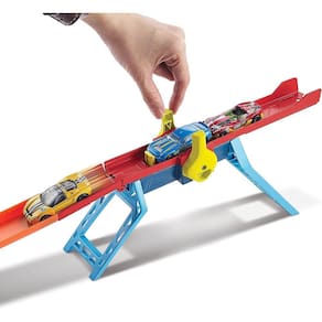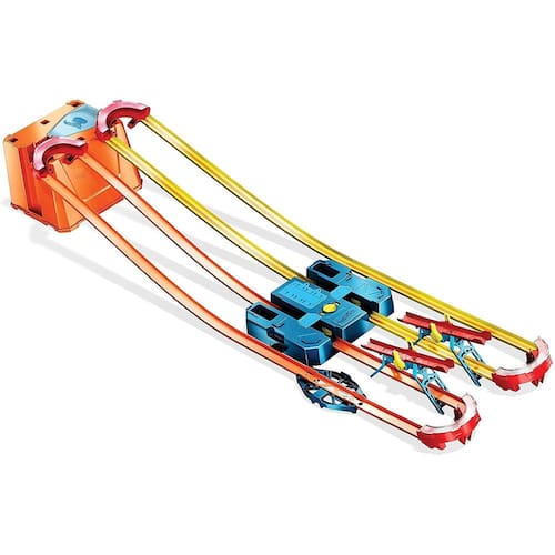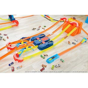 Inclui um inovador booster duplo na tampa e mais de 6 metros de pista e peças para mais de 4 configurações de corridas e acrobacias compatíveis com o Hot Wheels Race Portal (vendido separadamente)
