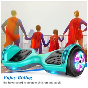 Este hoverboard em verde-água é um scooter elétrico autoequilibrado, ideal para jovens e adultos que buscam praticidade e estilo. Equipado com motor potente de 350W, atinge velocidade máxima de 16 km/h e autonomia de até 16 km, perfeito para deslocamentos urbanos e recreação. Possui bateria de íon de lítio 36V 4Ah, garantindo carregamento rápido e uso prolongado.