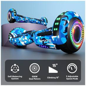 O hoverboard SIMATE Azul Camuflado combina tecnologia avançada, segurança e diversão para usuários de todas as idades. Equipado com sistema de autoequilíbrio e dois motores de 250W, suas rodas de 6,5 polegadas todo terreno garantem estabilidade e desempenho confiável, suportando até 100 kg. Fácil de aprender e usar, possui alto-falantes Bluetooth integrados, luzes LED brilhantes e rodas piscantes que tornam cada passeio mais seguro e divertido.