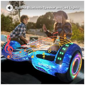 O Hoverboard SIMATE com longa duração de bateria é equipado com um sistema de auto balanceamento, dois motores de 250W, pneus todo terreno, ideal para crianças, adultos, meninas e meninos. Fácil de aprender e usar, com alto falantes Bluetooth, luzes de LED brilhantes e rodas piscantes para uma condução segura e divertida. Controle via aplicativo exclusivo XsCar para ligar/desligar, ajustar luzes, monitorar velocidade e bateria, definir modos de velocidade e muito mais. Possui rodas de 6,5 polegadas, estrutura de alumínio resistente, plataforma antiderrapante, motores duplos de 250W com velocidade máxima de 12 km/h, 3 modos de velocidade ajustáveis, alcance de até 12 km e carga máxima de 100 kg. Perfeito para crianças, adultos, meninas, meninos. Um ótimo presente para aniversários e festivais.