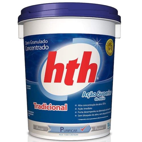 Cloro Granulado Hth Tradicional Para Piscinas 10 kg - Indicado para manutenção de piscinas; - Com 65% de cloro ativo; - Eficaz na eliminação de bactérias; - Possui ação superior do ativo; - Água purificada sem bloqueio do cloro, evitando desperdício; - Forte desempenho na eliminação de bactérias, - Possui ação imediata;