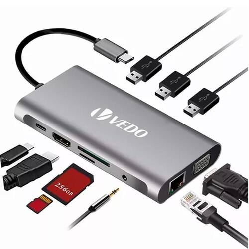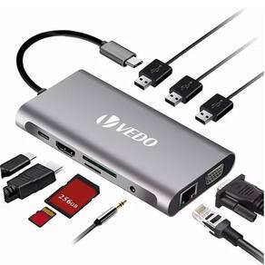 Dados Técnicos: - Compatível com laptops meeste com interface tipo C - Smartphones compatíveis com interface tipo C e função OTG - Interface 10 em 1: - 1* 4K (3840 x 2160 / 30HZ) HD MI - 1* VGA - 1* Gigabit Ethernet Lan RJ45 (banda de reprodução de 10/100/1000Mbps) - 3* USB 3.0 (overdach de dados de alta velocidade, flash disk/muis/toetsenbord enzovoort) - 1* Porta tipo C. - 1* Slot para cartão SD - 1* Slot para cartão TF - 1* Conector de áudio de 3,5 mm Compatibilidade: - Produto Compatível com Notebook, Tablets, Smartphones ou qualquer equipamento que possua entrada USB-C Thunderbolt 3 ou USB C 3.2 Gen 2.