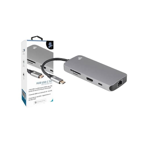 Hub Usb C 5+ 7x1 Usb 3.0 Leitor De Cartões Sd/micro Sd Hdmi Expanda as conexões do seu Notebook com o novo HUB USB-C 7x1 que possui USB, HDMI, Rede RJ45, USB-C, além de leitor de cartões SD e micro SD. Compacto, elegante e com a qualidade 5+, possui corpo em alumínio e dispensa o uso de fontes externas de alimentação