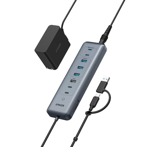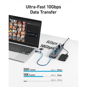 Hub USB-C Anker, hub de dados 11 em 1 de 10 Gbps com 4 portas USB-A e 4 USB-C, entrada PD-in USB-C de 100 W, leitor de cartão, conector USB 2 em 1, para laptop USB-A e USB-C, MacBook, iPad e muito mais (adaptador de 65 W incluído) - Conectividade 11 em 1: possui 1 porta PD-IN USB-C de 100 W, 2 portas USB-C de 10 Gbps 2 portas USB-C de 5 Gbps, 1 porta USB-A de 10 Gbps, 3 portas USB-A de 5 Gbps e leitores duplos de cartões SD e TD para uso versátil. - Transferência de dados ultrarrápida: desfrute de taxas de dados de 10 Gbps que são 20 vezes maiores que as taxas de USB 2.0 e 5 Gbps que são 10 vezes mais rápidas para máxima eficiência. - Carregue e sincronize de uma só vez: carregue seu laptop com uma porta PD-IN de 100 W no máximo e seu telefone e tablet com até 30 W no máximo, enquanto sincroniza dados sem problemas. Ao usar as duas portas USB-C de carregamento simultaneamente, cada porta tem uma potência máxima de saída de 15W. (Observação: o carregador de laptop não está incluído e deve ser adquirido separadamente.) - Conector para vários dispositivos: equipado com um conector 2 em 1 para alta compatibilidade com vários dispositivos que suportam conexões de desktop e laptop por meio de interfaces USB-A e USB-C - O que você obtém: Anker USB-C Data Hub (11 em 1, 10 Gbps), adaptador de alimentação de 65 W, ficha de segurança, garantia de 18 meses e nosso amigável atendimento ao cliente.
