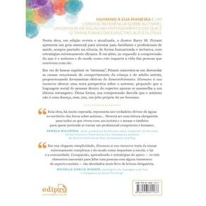 Humano à sua maneira é um livro de referência sobre autismo, um divisor de águas no entendimento do que é o transtorno do espectro autista (TEA). Nesta obra, em edição revista e atualizada, o doutor Barry M. Prizant apresenta um guia essencial para orientar pais, familiares e profissionais de saúde, sempre pautado na ciência, de forma humanizada e inclusiva, com estratégias extremamente eficazes. E vai além, ao expandir a compreensão do que é o autismo e do modo como este impacta a vida das pessoas que convivem com ele. Em vez de buscar suprimir os “sintomas”, Prizant concentra-se em desvendar as causas emocionais do comportamento da criança e do adulto autista, proporcionando ferramentas efetivas de desenvolvimento. Humano à sua maneira oferece uma nova perspectiva sobre o autismo, propondo que a linguagem social de pessoas dentro do espectro apenas se assemelha a um idioma estrangeiro. Dessa forma, sua compreensão desvela que o autismo não é uma doença, mas, sim, um jeito próprio de ser humano. “ Esta obra, há muito esperada, representa um verdadeiro divisor de águas no território dos livros sobre autismo... Deveria ser uma leitura obrigatória para todos os que vivem com um autista e o amam e também para quem pretende se tornar um profissional competente e humano. ” _Pamela Wolfberg, ph.D., professora de estudos sobre o espectro do autismo na San Francisco State University; fundadora e diretora do Autism Institute On Peer Socialization and Play “ Em sua elegante simplicidade, Humano à sua maneira trata de temas extremamente complexos e do modo como impactam a escola, o lar e a comunidade. Compaixão, aprendizado e estratégias de apoio — os três elementos essenciais para lidar com pessoas com algum transtorno do espectro autista — são abordados neste livro de leitura obrigatória. ” _Michelle Garcia Winner, patologista da linguagem e da fala e fundadora da Social Thinking® “Uma fonte de felicidade e de satisfação pessoal que todas as comunidades ligadas ao espectro do autismo fariam bem em adotar.” _Michael John Carley, pai de uma pessoa autista e também diagnosticado com o transtorno do espectro autista; fundador do GRASP e autor de Asperger s from the Inside Out “ O currículo do doutor Prizant dispensa comentários. Durante cinquenta anos, o autor colecionou experiências como professor universitário, palestrante, consultor e fundador de diversos programas de intervenção para autistas em muitas partes do mundo. Entretanto, quando li este livro, o que mais chamou minha atenção nãofoi seu currículo ou suas publicações científicas, e sim sua humanidade. Prizant me trouxe a sensação de estar sentada no jardim, em sua companhia, com uma xícara de café, tendo a honra de ouvir, por horas, suas vivências de forma descomplicada e mágica.” _Wandersonia Medeiros, psicóloga, neuropsicóloga, doutora em neurociências e apaixonada pelo espectro do autismo, em prefácio para esta edição