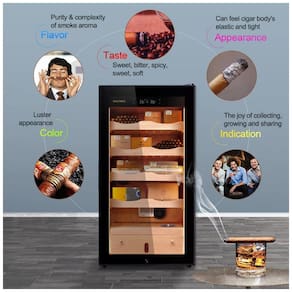 ARMAZENAMENTO DE CHARUTOS O gabinete possui umidade interna, resfriamento por ventilador, sistema de desumidificação de aquecimento PTC que contribui com um ambiente de temperatura e umidade constantes para manter seu charuto no melhor estado Perfeito para armazenar e envelhecer seu charuto