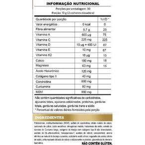 Polidextrose, metilsulfonilmetano MSM , sulfato de condroitina, citrato malato de cálcio, carbonato de cálcio, ácido ascórbico,dimagnésio malato, hialuronato de sódio, extrato de rizomas de Curcuma longa, colágeno de frango com colágeno tipo II não desnaturado, acetato de DL-alfa-tocoferol, menaquinona-7, acetato de retinol, colecalciferol, aroma idêntico ao natural de laranja e acerola, acidulante ácido cítrico, regulador de acidez citrato de sódio, antiumectante dióxido de silício e edulcorantes sucralose, glicosídeos de steviol e taumatina.