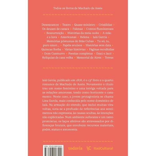 Título Do Livro: Iaiá Garcia Série: Coleção Machado de Assis Autor: (Diseño o ilustración de cubierta de) Trench, Daniel Idioma: Português Editora Do Livro: Todavia Capa Do Livro: Mole Ano De Publicação: 2025 Quantidade De Páginas: 256 Altura: 19.5 cm Largura: 12.5 cm Peso: 270 g Gênero Do Livro: Literatura e ficção Subgêneros Do Livro: Ficção Data De Publicação: 10-03-2025 Marca: Não Informado