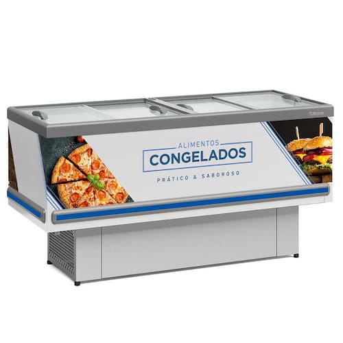 Expositor Ilha Vidro Reto Linha Plus GESV190 R Gelopar. Exposição e conservação de produtos congelados ou resfriados em geral. Com o Freezer Horizontal GESV190 Gelopar, seus alimentos ficarão bem conservados e organizados. Ilha dupla ação: Congelados -16° a -20°C e resfriados 0° a +7°C. Refrigeração estática com serpentina de cobre. Termômetro analógico. Degelo Manual. Pés niveladores. Controle de temperatura por termostato. Divisórias internas aramadas e ajustáveis. Tampas em vidro reto temperado, deslizante, de baixa emissividade. Vidros sujeitos a condensação da umidade do ar. Revestimento interno em aço pré-pintado branco e externo em aço pré-pintado e acabamento com adesivo. Disponível com os adesivos nas cores Branco ou Preto. CAPACIDADE: 525L. PESO: 110kg. TEMPERATURA: resfriados +1° a 7°C/ congelados -16° a -20°C. CONSUMO: 5,06 kWh/dia. DIMENSÕES EXTERNAS (CxAxL): 189x95x80cm. Ilha para congelados GESV-190 R Gelopar é na Atau. Equipamento certificado conforme Portaria Inmetro nº 371/2009