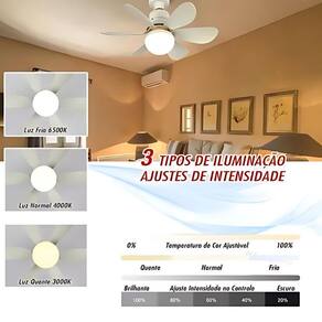 Especificação: Tipo: controle remoto Temperatura de cor: 3000 K - 6500 K cores Pás do ventilador opcional : branco, multicolorido, Tamanho do corpo da lâmpada cm : 52 cm x 20 cm Potência total: 30 W Parâmetros do ventilador: 5 pás. Potência: primeira marcha 12 W; segunda marcha 9 W; Tensão de entrada: detecção de 86 V-265 V