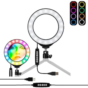 Este iluminador led circular 8 mj20 rgb 25w soft ring light live 20cm usb com mini tripé e suporte smartphone com 80leds de alta qualidade. O led circular soft ring light live de modo de iluminação de cores rgb, e potência de 25w, possui brilho ajustável para sua escolha 10-100% 10 níveis , você pode ajustar a cor e o brilho muito facilmente, o brilho perfeito pode ser alcançado sem a instalação de filtros coloridos extras, com temperatura de cor de 3000k a 6000k. Ele oferece iluminação profissional mais difusa ao redor da imagem, reduzindo a aparência de sombras, e garantindo que as fotografias e filmagens possam obter a melhor luz possível com esse iluminador compacto.Modo rgb arco-íris ajustávelesse ring light de led para selfie de 8 rgb e 25w pode ser ajustado continuamente de 3000k de luz quente para 6000k de luz do dia, e, além de ter brilho ajustável de 10% a 100% de forma contínua, você pode pressionar o botão dimmer para alterar a temperatura de cor rgb de 360 não há necessidade de alterar os filtros de cores , é muito fácil de obter efeitos diferentes e atender a diferentes ocasiões, perfeito para vídeos do youtube / maquiagem / vlog / fotografia / festa e transmissão .Plugue usbprojetado com um plugue usb com comprimento de 200 centímetros, você pode conectá-lo em seu pc de mesa, energia móvel, plugue de carga ou seu soquete usb a qualquer hora que você quiser.Base com cabeça ball head e mini tripé de mesavem com cabeça de tripé ball head de sapata fria para apoiar a rotação de 90 graus ou 360 graus da luz do ring light; pode ser como lâmpada de mesa ou lâmpada de assoalho se você preferir. Adequado para sala de estar, sala de estudo, quarto do bebê, banheiro ou escritório. O mini tripé de mesa em metal com altura máxima de 12cm, suporta até 3kg é um mini tripé totalmente estável e totalmente metálico para aprimorar a função do seu dispositivo, universal com base de rosca 1/4o iluminador led circular rgb ring light live com diâmetro de 8 / 20cm é super fácil de montar e usar, perfeito para iluminação fotográfica ao ar livre, luz de preenchimento em ambientes fechados, retrato, moda, festa, equipe, maquiagem, arte de casamento, fotografia publicitária, gravação de vídeo e etc.Principais características: cores de luz: branco quente, branco frio, branco natural + rgb Iluminador led circular regulável com uma brilho ajustável de 10-100% 10 níveis Vida útil longa de mais de 50000hrs. Cabeça ball head com rotação de 360 graus pan e tilt. acompanha mini tripé de mesa com altura máxima de 12cm Suporte estilo ganso de celular/smartphone entre 5.7 a 8.0 centímetros Sem radiação ultravioleta e infravermelha, baixa produção de calor, segurança e proteção ambiental.Fácil de montar e usar, perfeito para iluminação fotográfica de produções de maquiadores, preenchendo a luz dentro de casa, retrato, moda, arte do casamento, fotografia de propaganda, gravação de vídeo, vlogs, equipamento de vídeo para youtuber, retratos, selfies, live streaming, e muito mais.