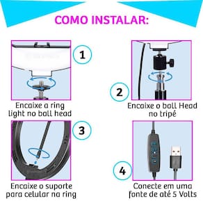 Embalagem contém: - Ring Light 10 26cm ; - Adaptador de celular; - Tripé altura máxima de 2,1m ; - Controle de intensidade de iluminação no cabo Importante Utilizar fonte de energia de no máximo 5W a 9W para não danificar o produto. Garantia 90 dias pelo fabricante