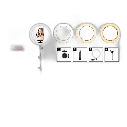 Embalagem contém: 1 - Ring Light 10 26cm ; 1 - Adaptador de celular; 1 - Tripé altura máxima de 2,1m ; 1 - Controle de intensidade de iluminação.