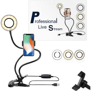 Especificações: Modelo: Professional Live Stream Peso: 480g 3 modos de luz (branca, amarela e mista) e 9 níveis de brilho Potencia: 12w Material: Aço e plástico ABS Cabo usb aproximadamente: 1,20m Altura máxima aproximada: haste ring light 61,5 cm e haste smartphone 34,5 cm Diâmetro aproximado do ring light: 8,5 cm Compatibilidade: Largura máxima aproximada do suporte telefone é de 8,6 cm Conexões: USB 5V