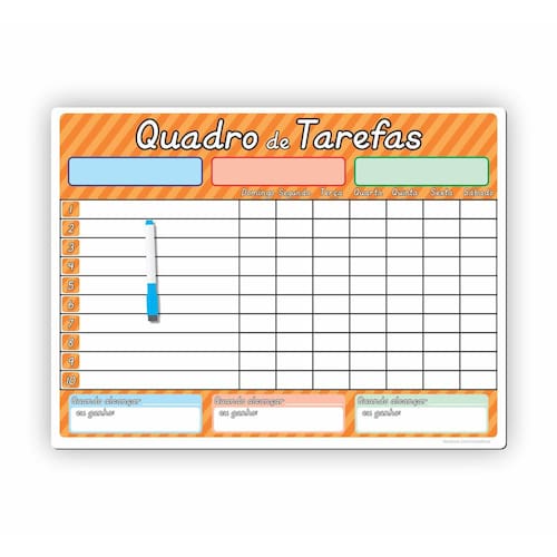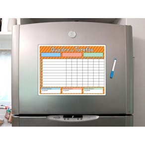 Os Nossos Imãs para geladeira são impressos com tinta Eco-Solventes com qualidade fotográfica em Vinil Autocolante e depois fixado em uma Manta Magnética com 0,8 mm espessura, ideias para serem fixados em geladeiras. São ideais para quem quer fazer mudanças no ambiente da cozinha de sua casa sem gastar muito, além do seu preço acessível dispensa a contratação de profissionais, já que você mesmo a pode fazer a instalação. Painel Magnético Quadro de Tarefas. Medida do painel: 40 cm x 30 cm. O painel magnético colorido é perfeito para recompensar o bom comportamento das crianças em casa, creches ou escolas. Como utilizar: 1- Relacione as tarefas; 2- Marque se as mesmas foram concluídas ou não; 3- Defina o nº de pontos e a recompensa por semana. acompanha uma caneta azul com imã e apagador + recarga azul Recomendações: - Faça a limpeza periódica do seu quadro de tarefas com removedor. Marca: Não Informado Ean: 7898667231201