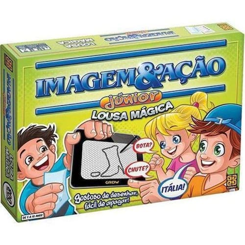 O clássico jogo de desenho e adivinhação agora em versão para as crianças e com uma superlousa que apaga como se fosse mágica!