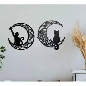 Sua compra inclui: 2 Cuadros con figura de gato en una lunaMedidas: 39cm x 36cm (cada um) Material: Madeira MDF 3mmVene con fita dupla face para ser colocado diretamente na parede (Se recomienda que a superfície seja limpa) Envios a todo Chile