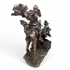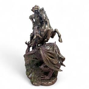 Destaques do Produto: Design realista e impactante – São Jorge montado em seu cavalo, em batalha contra o dragão. Acabamento em bronze envelhecido – visual nobre e elegante. Altura de 27 cm – tamanho ideal para decoração ou altar pessoal. Feita em resina resistente – durabilidade e riqueza nos detalhes. "São Jorge, guerreiro da luz, protegei-nos em todas as batalhas."