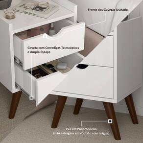 Características: - Pintura ultravioleta; - 2 gavetas com puxadores novo designer; - Corrediças telescópica; - Pés em Polipropileno. - 1 Nicho superior -Peso máximo por gaveta 5kg