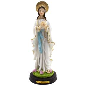 Imagem Nossa Senhora de Lourdes Resina 22 cm Nossa Senhora de Lourdes é uma das atribuíções de Virgem Maria e que surgiu com relatos das aparições a Santa Bernardete Soubirous, numa gruta de Lourdes, na França. Conehcida como a padroeira dos enfermos. Dimensões: altura: 22 cm - Largura: 8 cm - Profundidade: 8 cm Dimensões aproximadas do produto. Produto pintado a mão, podendo sofrer variações de cores. Marca: Não Informado