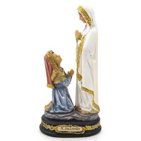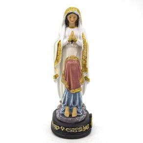 Imagem Nossa Senhora de Lourdes com Bernadete Importada Resina 13 cm Nossa Senhora de Lourdes é uma das atribuíções de Virgem Maria e que surgiu com relatos das aparições a Santa Bernardete Soubirous, numa gruta de Lourdes, na França. Conehcida como a padroeira dos enfermos. Dimensões: altura: 13,5 cm - Largura: 7 cm - Profundidade: 5 cm Dimensões aproximadas do produto. Produto pintado a mão, podendo sofrer variações de cores. Marca: Amém Decoração Religiosa Ean: 6988051083125