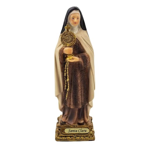 Imagem Santa Clara Importada Resina 14 cm Santa clara nasceu no ano de 1194 em Assis Itália é aclamada como a Padroeira da comunicação de da televisão. Dimensões: altura: 13,5 cm - Largura: 4 cm - Profundidade: 4 cm Dimensões aproximadas do produto. Produto pintado a mão, podendo sofrer variações de cores. Marca: Não Informado