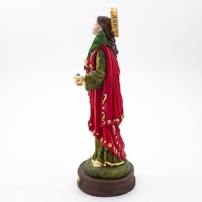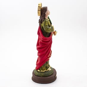 Imagem Santa Luzia Resina 20 cm Santa Luzia é conhecida como santa protetora dos olhos. Dimensões: altura: 20 cm - Largura: 8 cm - Profundidade: 6,5 cm Dimensões aproximadas do produto. Produto pintado a mão, podendo sofrer variações de cores.