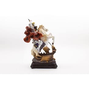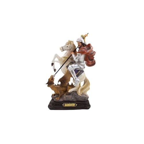 Imagem São Jorge Importada Resina 20 cm São Jorge é representado como um guerreiro montado em um cavalo branco, lutando com um dragão com sua lança. Dimensões: altura: 26 cm - Largura: 14 cm - Profundidade: 8 cm Dimensões aproximadas do produto. Marca: Amém Decoração Religiosa Ean: 6988102636232