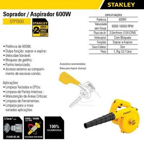 SOPRADOR ASPIRADOR 600W 127V STANLEYDescrição:Soprador / aspirador 600w STPT600-BR, que traz em sua composição poliamida e fibra de vidro.Ideal para limpeza de quintal, galpões e sucções leves após o corte de gramas, folhas e outros detritos.Especificações Técnicas:Potência: 600WRotações por minuto: 6.000 - 16.000 RPMDupla função: soprar e aspirarControle de velocidadeGatilho com trava para uso contínuoPunho texturizado para melhor agarreAcesso externo ao compartimento de escovas carvãoAcompanha bico para aspiração, coletor de pó e manualPeso: 1,7Kg.Marca: StanleyCódigo: 78167
