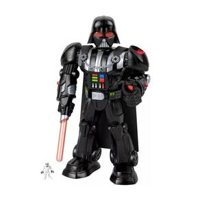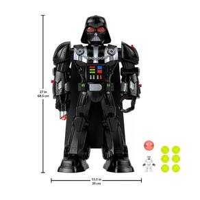 Aventuras robóticas com um personagem lendário! Os jovens fãs podem conhecer o comandante militar mais famoso do Império Galáctico com a incrível brincadeira robótica do Imaginext STAR WARS Vader-Bot da Fisher-Price! Com mais de 60 cm de altura, esse robô de brinquedo interativo Darth Vader está repleto de ação controlada pelas crianças, incluindo um lançador de discos que se abre, um acessório de sabre de luz extensível e um lançador de bolas inspirado na Força, além de luzes legais e sons familiares do personagem. Inclui um brinquedo com chave do personagem Stormtrooper de 7 cm e 7 projéteis para brincar.