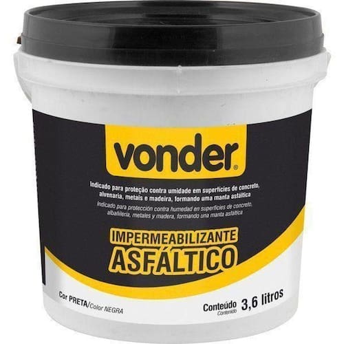 Especificações técnicas: - marca: vonder - código: 51.99.000.036 - conteúdo do impermeabealizante: 3,6 litros - cor do impermeabealizante asfáltico: preto - a base de água - medidas aproximadas da embalagem (axlxc): 19x19x19 cm - peso aproximado da embalagem: 4 kg