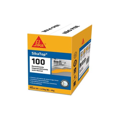 Sikatop 100 é um revestimento, semi-flexível, impermeabilizante e protetor, Bicomponente, à base de cimento, areias selecionadas e resina acrílica para uso Em concreto, argamassa ou alvenaria com excelente aderência e Impermeabilidade. Sikatop 100 é fornecido pronto para o uso, bastando misturar Os componentes a líquido e b pó .