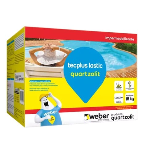 IMPERMEABILIZANTE TECPLUS 18L QUARTZOLITimpermeabilizante tecplus lastic quartzolittecplus lastic quartzolit é um impermeabilizante flexível e elástico para lajes e reservatórios elevados e enterrados.Pode ser utilizado em lajes, terraços, sacadas, reservatórios de água elevados ou enterrados, piscinas frias ou aquecidas, pisos em contato com o solo, e áreas frias como banheiros e cozinhas. Áreas internas e externas. Bicomponente de base cimentícia. Resistente a pressões hidrostáticas positivas e negativas. Alta aderência e fácil aplicação. Não altera a potabilidade da água. Excelente acomodação de fissuras. Aceita acabamento com pintura ou revestimento cerâmico diretamente. Pode ser aplicado em placas de Drywall RU e RF da Placo, com reforço de tela estruturante.É necessário reforçar cantos e ralos com tela estruturante quartzolit. Para áreas acima de 25 m² aplicar tela em toda a área.Embalagem: disponível em caixa de 18kg.Cor: CinzaValidade: 12 mesesAlta resistência Alta aderênciaSuporteLaje e Telhado, Piscina, Fundação e AlicerceSobre este produtoAplique uma tela de poliéster na área a ser impermeabilizada, colocando-a sobre a primeira demão, com o produto ainda fresco, inclusive em cantos e ralos.Em regiões como cantos vivos, ao redor de ralos, passagem de tubulação, juntas de concretagem, etc., a tela de poliéster pode ser substituída por tecido não tecido (TNT). Também pode-se reforçar o revestimento com banda elástica.Se o revestimento final for de pedras de peso como mármores e granitos, recomendamos uma proteção mecânica antes do assentamento, para evitar que o elevado peso das pedras gere impacto sobre a camada impermeabilizada.Use EPIs.O projeto de impermeabilização deve obedecer à Norma de Impermeabilização NBR 9.575.Características e Benefícios* Resistente a pressões hidrostáticas positivas e negativas* Alta aderência e fácil aplicação* Atóxico: não altera a potabilidade da água* Tem excelentes acomodações de fissuras* Aceita acabamento com pintura ou revestimento cerâmicoContra indicado para* Aplicação sobre revestimentos cerâmicos e proteções térmicas.* Uso como acabamento.* Aplicação sem o uso de tela de poliéster.* Imagens meramente ilustrativas * Marca: QUARTZOLITCódigo: 78868