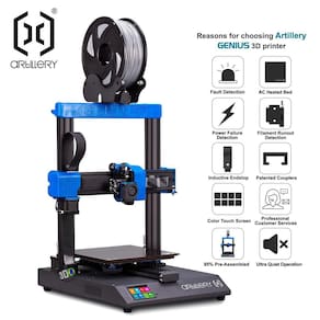 A impressora 3d genius da artillery é uma impressora carteziana, com módulos pré-montados, o que facilita e agiliza a montagem do equipamento. Seu gerenciamento de cabos é discreto, bem organizado e contribui para um conjunto esteticamente bonito, minimalista e equilibrado. Sua mesa aquece rapidamente e a superfície ultrabase apresenta ótima adesão para a maioria dos filamentos plásticos de mercado. Possui nivelamento manual, e facilidade para upgrade de nivelamento automático, com previsão de conectores específicos para instalação do sensor de nivelamento. Equipada com extrusora titan extruder direct drive e bico volcano, proporciona perfomance superior para trabalhar com filamentos mais desafiadores como os flexíveis, tpu, tpe, etc