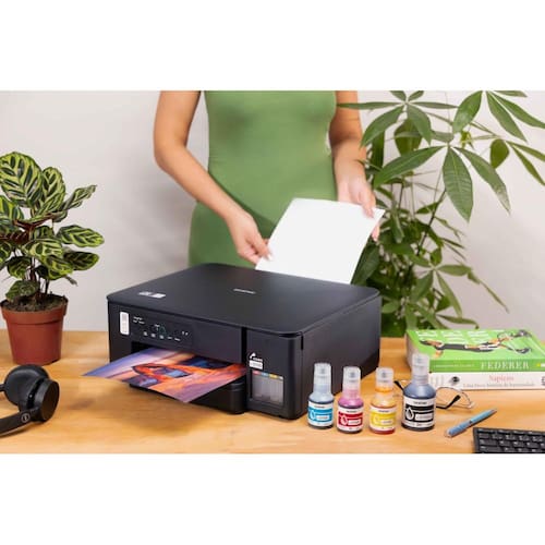 Acompanha um kit de suprimentos que inclui 1 garrafa de tinta preta com rendimento de até 7.500 páginas e 1 kit de tintas coloridas (ciano, magenta e amarelo), com rendimento de até 5.000 páginas cada. Para garantir resultados consistentes e duradouros, recomenda-se o uso exclusivo de tintas autênticos Brother.