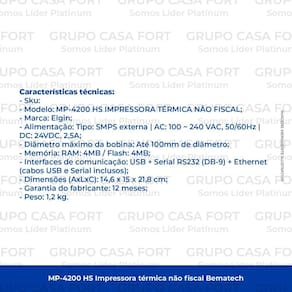 Conectividade e compatibilidade Esse modelo conta com 3 interfaces de comunicação: usb, serial e ethernet. Além disso, a impressora bematech mp-4200 hs é 100% compatível com os modelos i8 e i9 e pronta para trabalhar com os principais softwares de automação comercial.